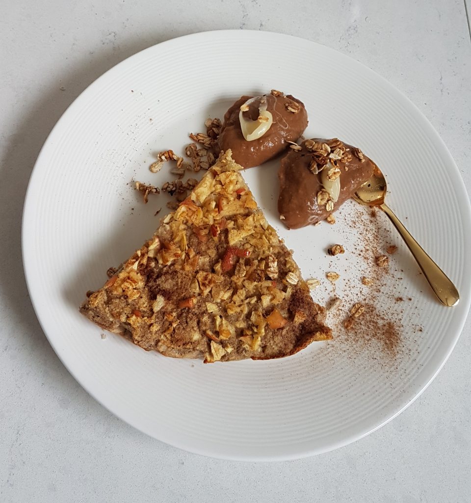 Deze appeltaart zit vol met gezonde ingrediënten. Hij is lekker en smeuig, niet zoet, maar dat kan je verder zelf bepalen. Je kan honing, suiker of meer rozijnen toevoegen. Als ontbijt, lunch of toetje is dit prima! De chocomousse die erbij zit, is van avocado, banaan, zoete aardappel en cacao. Recept staat op mijn website.