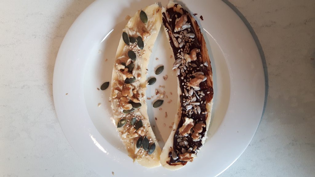 Bananen toetje of tussendoortje, zelfs als ontbijt kan deze banaan met topping!