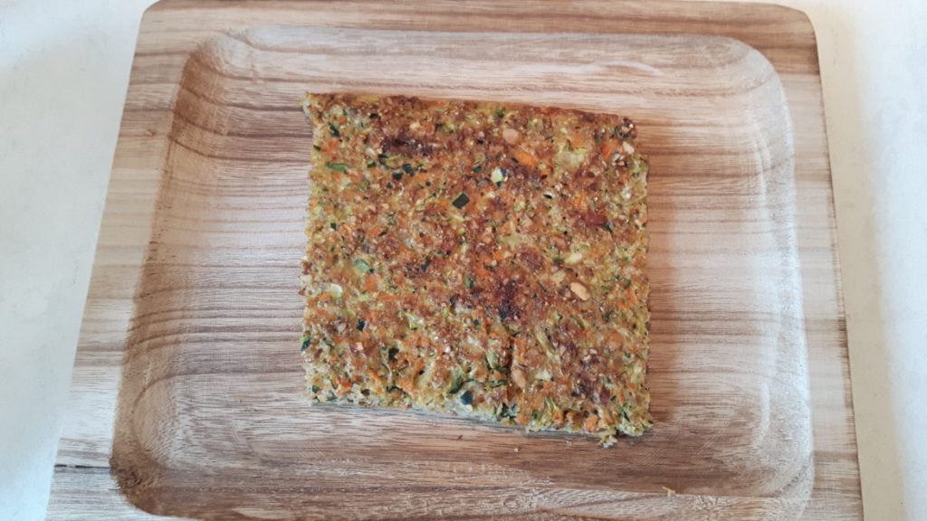 Ik was begonnen met groenten brood, ongeveer hetzelfde recept, maar dan in een cakeblik. Maar op een bakplaat wordt het nog veel lekkerder! In een cakeblik blijft er veel vocht in en nu niet, je proeft de kaas veel beter, kortom..jammie….en erg voedzaam door de groente, eiwitten en noten. Je krijgt alles binnen wat je in een maaltijd nodig hebt.